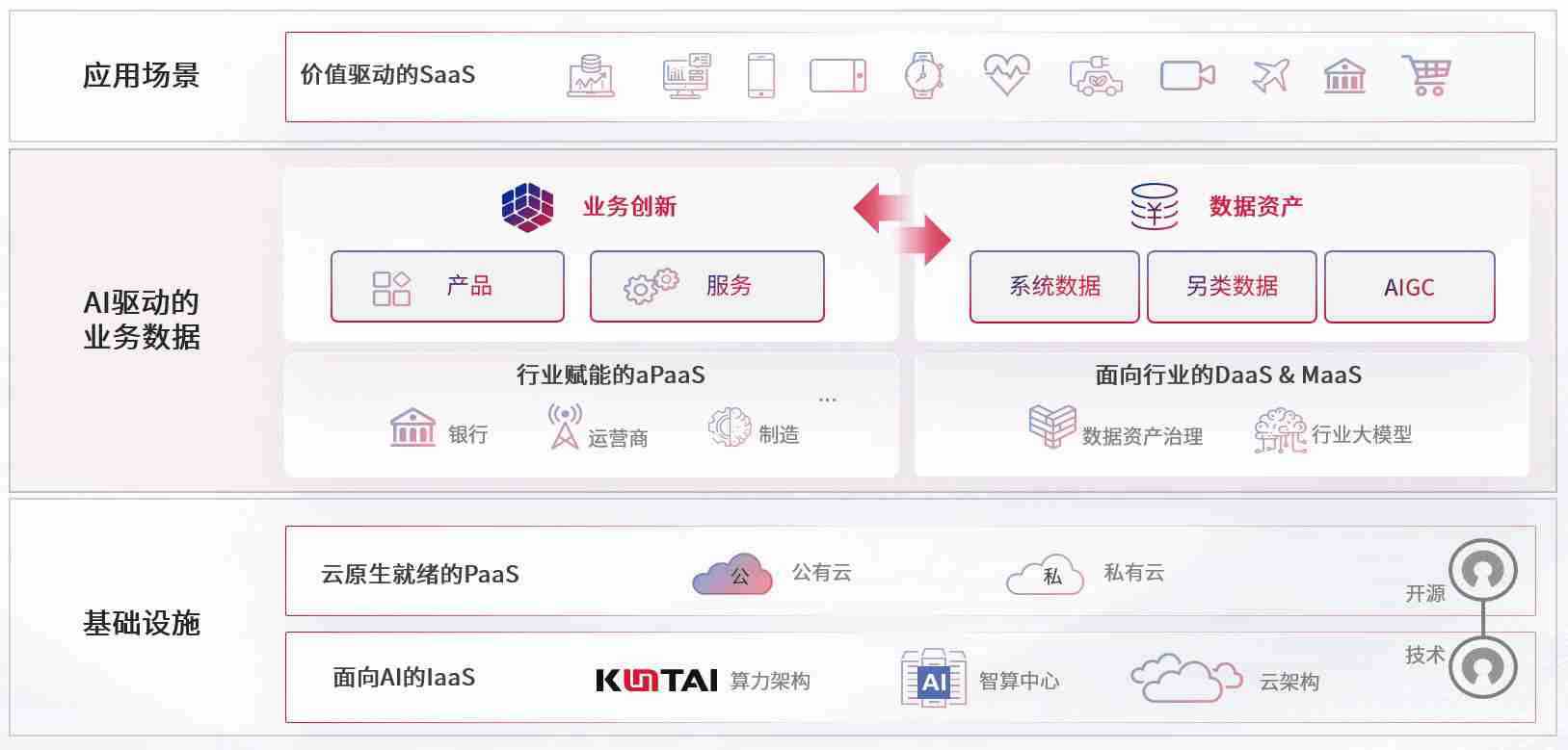 数字时代,,围绕企业数字化转型的关键要素,,,,2939威尼斯数码开创性的提出数云融合战略和技术体系框架,,,着力在云原生、、、数字原生、、AI原生和信创产业上架构产品和服务能力,,,为处在不同数字化转型阶段的快消零售、、、、汽车、、、、金融、、、医疗、、政企、、教育、、、、运营商等行业客户提供泛在的敏捷IT能力和融合的数据驱动能力,,,构建跨界融合创新的数字业务场景和新业务模式,,,助力企业级客户建立面向未来的核心能力和竞争优势,,全面推动社会的数字化、、、智能化转型升级。。。